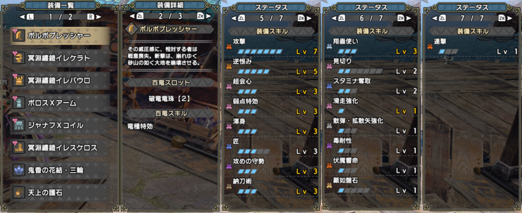 - 基本的なスキル → 攻撃7、超会心3、弱点特効3、渾身3、匠3、見切り2