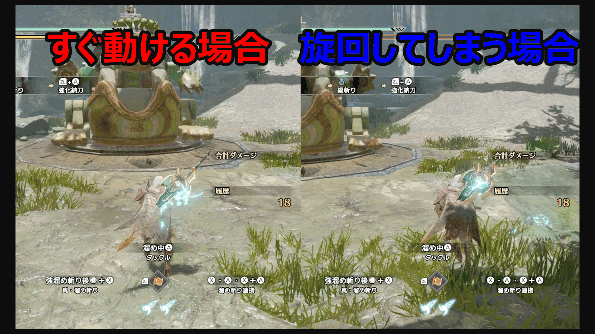 ハンターは強化納刀後、真後ろに移動しようとすると大きく旋回し、タイムロスとなってしまうので、納刀後のハンターの向きを意識しましょう!