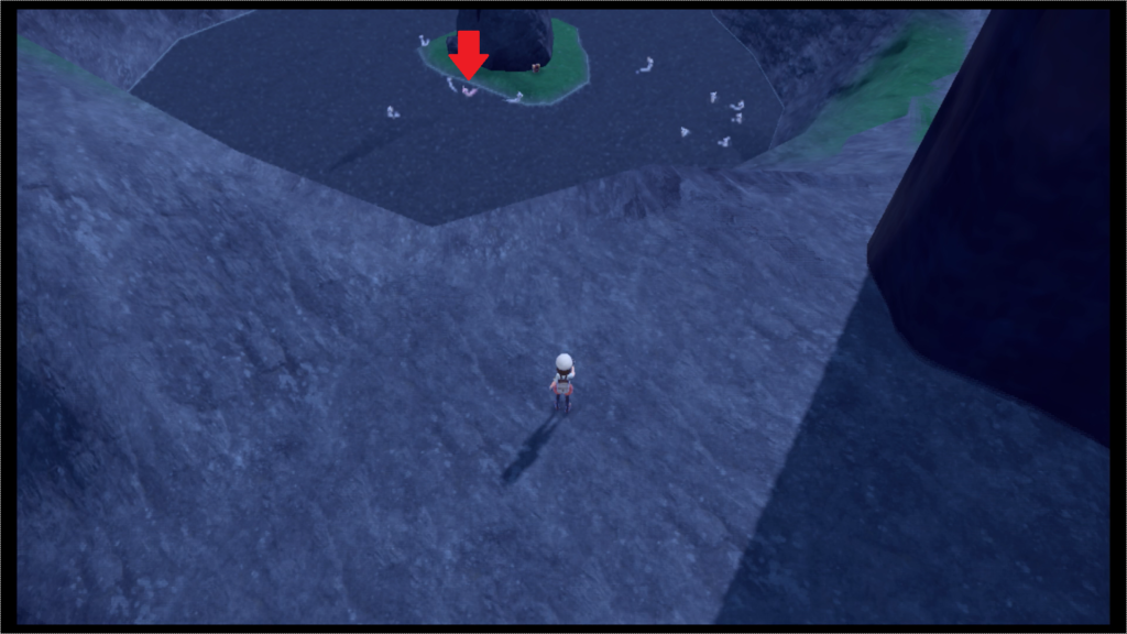 この石の壁の上から見下ろす感じですね。目印は壁に一本だけ生えた黒い棒(?)の左側です。