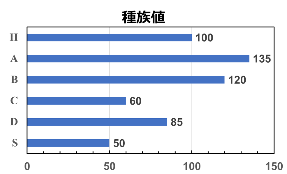 合計種族値は550と600族には届かないものの、必要のないCやSが大きく削がれ、バランス良く配分されています。