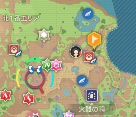 今回の厳選ポイントは北2番エリアのポケモンセンター右上ですね。下図の旗の位置です!