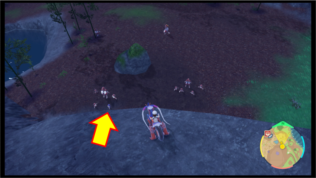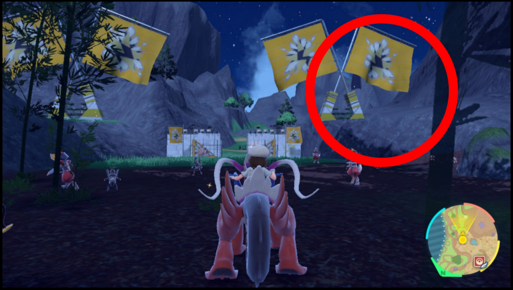 - 色違いがいないことを確認したら、アジトの奥の方(ゲートに一番近いテント付近)に向かって移動して元の位置に戻ってきます。
