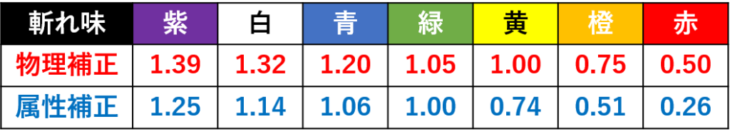 斬れ味補正についての詳しい検証は皆で一緒にモンハンライフの@あっとさんが行っているので覗いてみてください