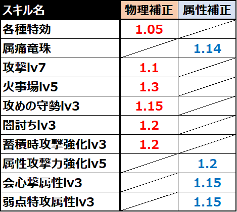 基本的にモンハンに存在する乗算でのダメージ増加系スキルは1.05~1.20程度(↓の表参照)であり、1.25ましてや1.4倍は破格と言えます。