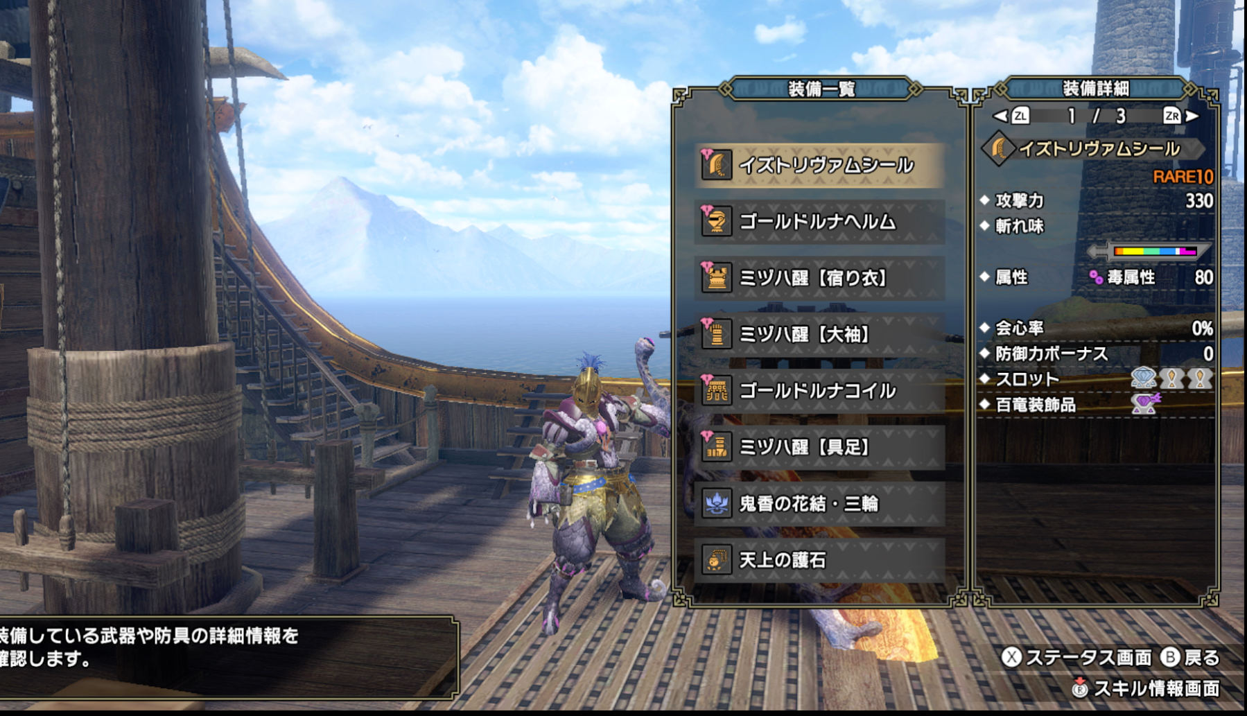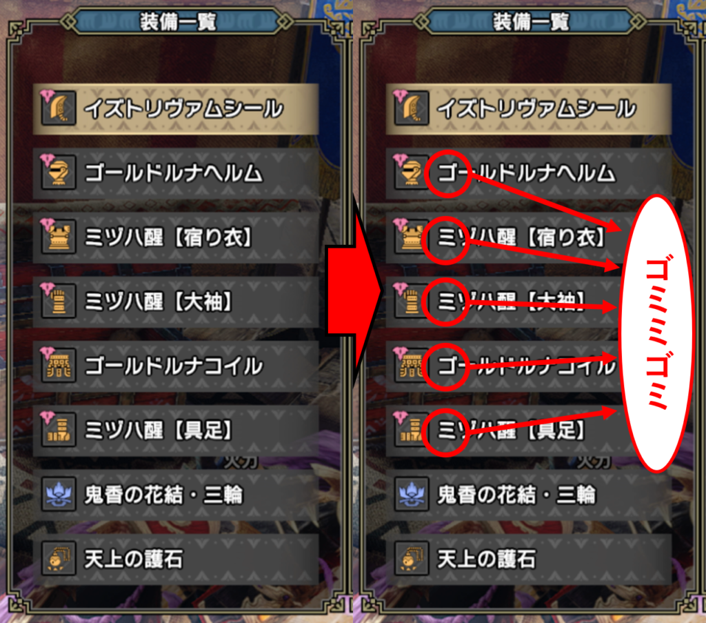 ゴミミゴミとは『傀異克服オオナズチ』の防具(ミヅハ醒シリーズ)と『リオレイア希少種』の防具(ゴールドルナシリーズ)を組み合わせた装備です。